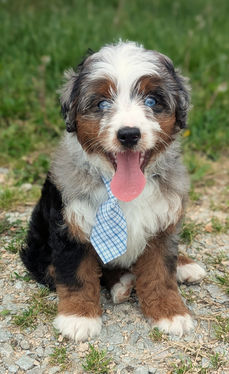 Maverick is a stunning, Merle Tri multigenerational Bernedoodle boy with the most piercing blue eyes! He is highly affectionate and wants to be right by your side all the time. We are looking forward to his babies in the future!